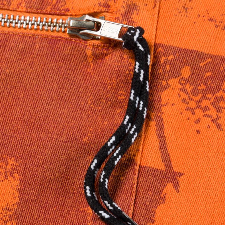 pro 64 къси панталони от архива на umbro от издръжлива, изпрана памучна тъкан. с ластик на талията, памучна връзка на талията и заден джоб с цип. като се има предвид обработката на Овен с персонализиран изцяло ситопечатен дизайн, напръскан с кал, поставени лога за сътрудничество и боядисани в прашен оранжев цвят.