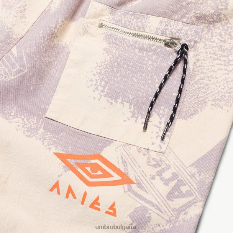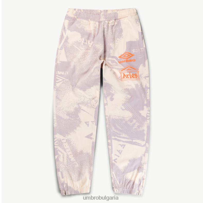 професионален панталон от архива на umbro от издръжлива, изпрана памучна тъкан. с еластичен колан и маншети, метални ципове на глезените, памучна връзка на талията и заден джоб с цип. като се има предвид обработката на Овен с персонализиран изцяло ситопечатен дизайн, опръскан с кал, контрастни лога за сътрудничество и боядисани в алабастър.